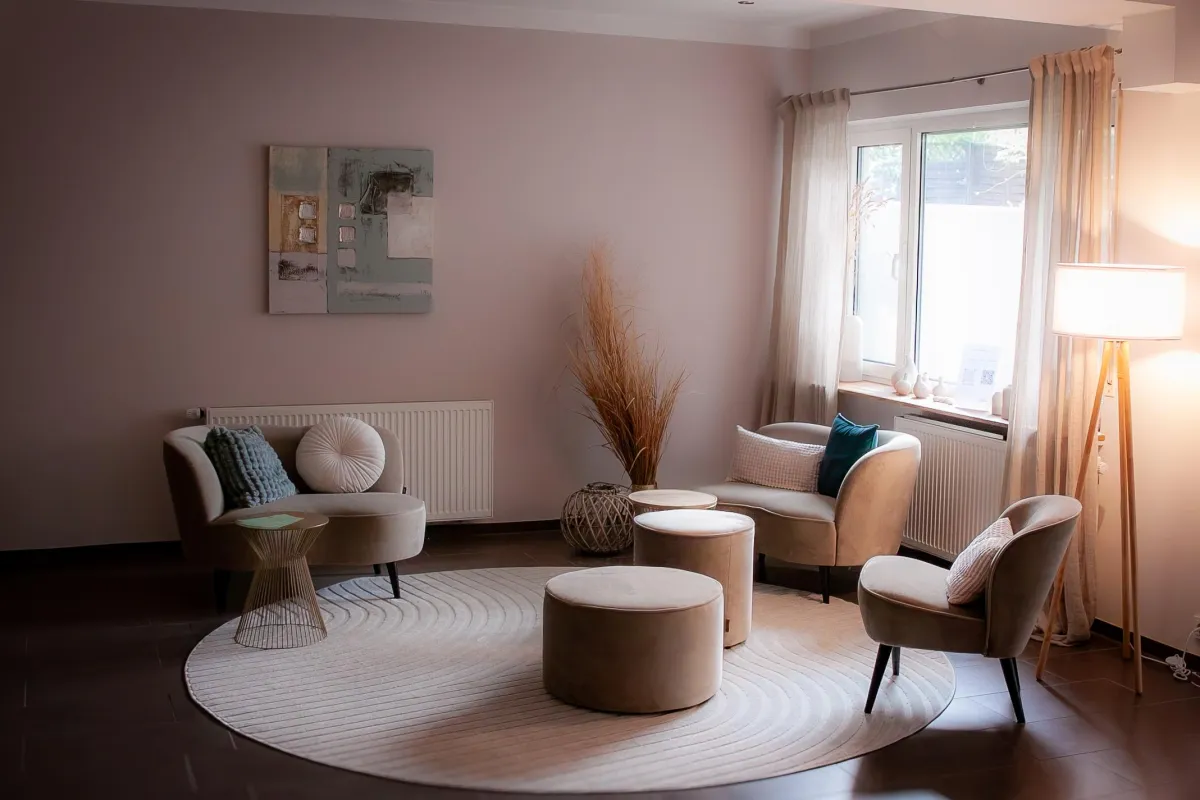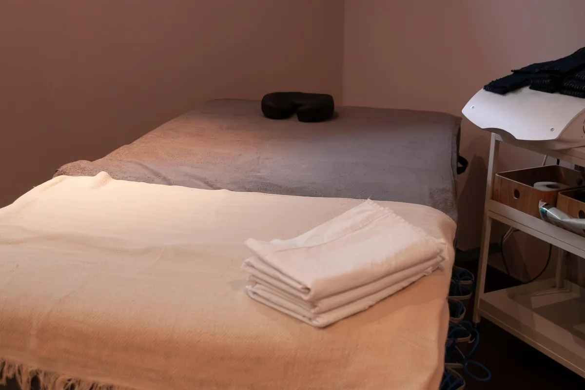 Dieser Raum hat eine breite Behandlungsliege, zwei Sessel, zwei Tischchen, einen grossen Spiegel und indirekte Beleuchtung.